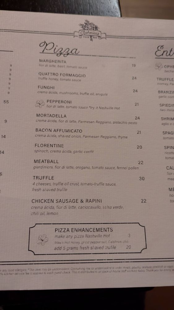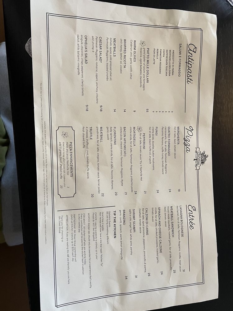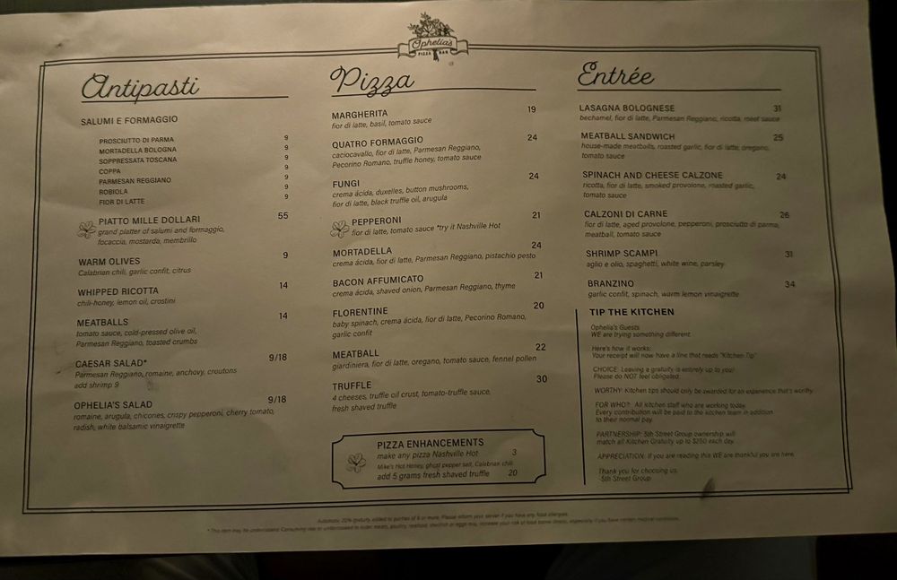 If you're looking for a trendy and romantic spot in Nashville to enjoy Italian cuisine, look no further than Ophelia's Pizza + Bar. Located at 401 Church St Ste 100, this restaurant offers a variety of pizzas, sandwiches, and other Italian dishes. Customers rave about their Truffle Pizza, Mortadella Pizza, and Whipped Ricotta. The ambiance is cozy with walls adorned with old framed photos and a unique touch of receiving your check in a copy of Hamlet. The service is prompt and professional, with attentive waitstaff who are happy to answer any questions about the menu. Whether you're in the mood for a hearty meat calzone, flavorful shrimp scampi, or a Neapolitan-style pizza, Ophelia's Pizza + Bar has something for everyone. Don't miss out on their large portions, great taste, and fast and friendly service – it's an experience worth repeating.